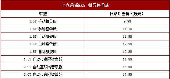 最终推荐:豪华版或互联网智享版是最佳选择 用户完全可以根据自己的需要找到适合自己的一款荣威RX5的车型。而如果小编来推荐的话: 对于家庭用户来说,手动或自动豪华版是比较值得的选择,因为这一款在安全性上配备的比较全面,舒适性配置也能够满足家庭用户的需求。 而针对高端用户或对配置要求较高的用户, 1.5T或2.0T的互联网智享版,不仅提供了更丰富的配置,更重要的是加入了更多的互联网功能,能够大幅提升用车的智能性和豪华感。