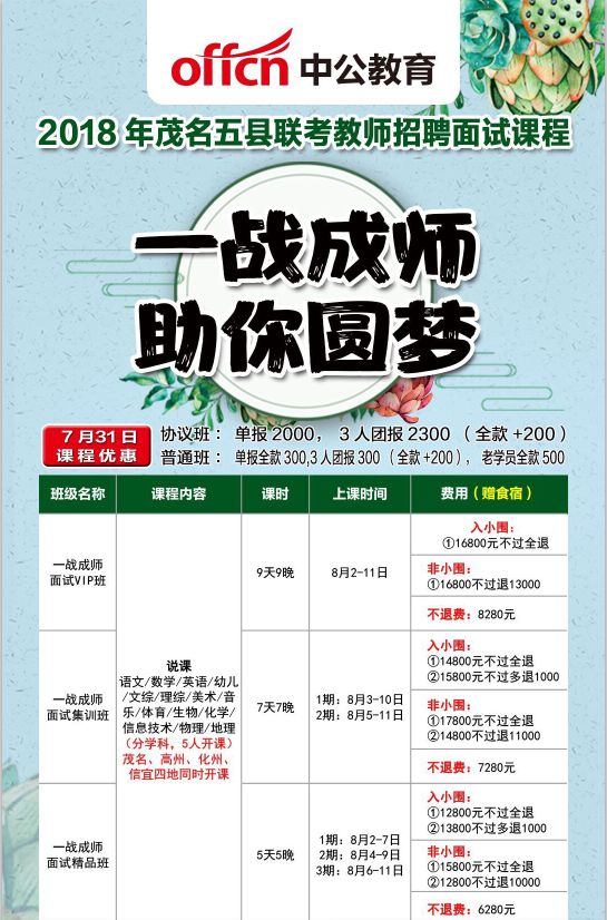 茂名联考成绩已出,还没查询成绩的记得抽时间查一查; 你进面了,柠檬建议来报个面试班,分学科授课,够5人就开课,不过全退(不过多退)均有,赠送食宿。让你安心学习上岸; 如果你不想报班学习,也记得看看下面免费的说课资料和直播讲座,柠檬希望能为你上岸提供一点点帮助