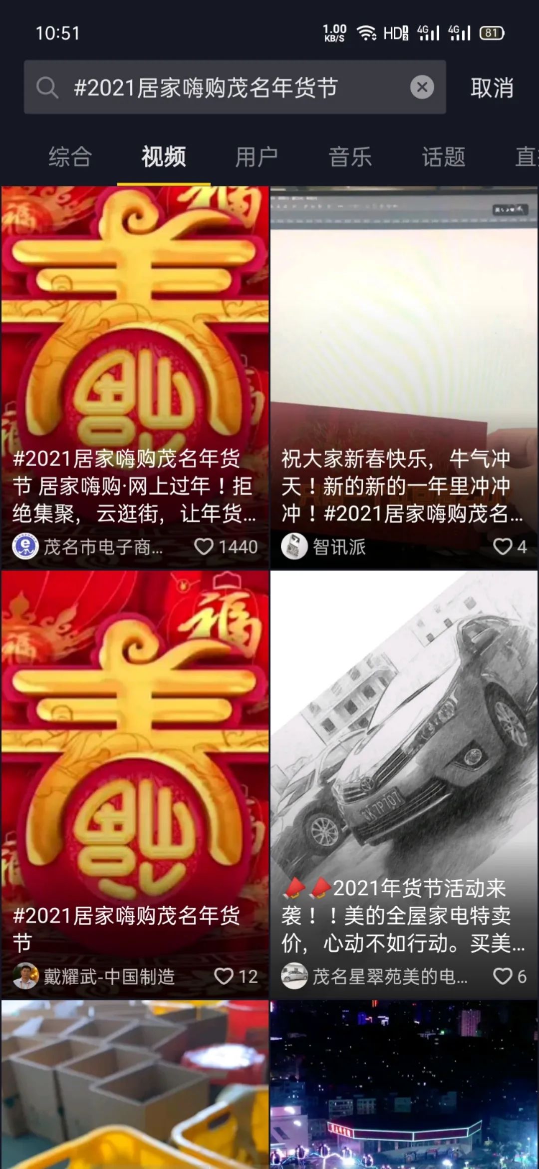 茂名年货节“居家嗨购,茂名年货”通过抖音平台为全市电商企业实行产品推广,在抖音搜索话题 #2021居家嗨购茂名年货节 ,点击即可参与话题流量推送,同时欢迎广大群众发送视频时加入 #2021居家嗨购茂名年货节 话题,把身边的年味分享给大家,通过趣味创新的新年互动,即有机会让身边的人收到最地道的年味! 抖音茂名年货节话题到今天已累计有35.5w的播放量,该话题关注度每天持续提升中。