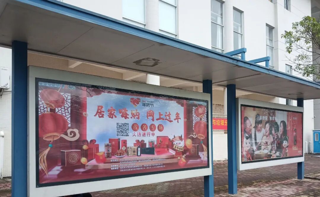 在茂南区内多处商城的Led大屏,和南方书城、贵宾馆 、华美整容医院、电动车总汇 、广发银行等地人流密集的公交候车亭投放灯箱广告,营造年货街氛围。